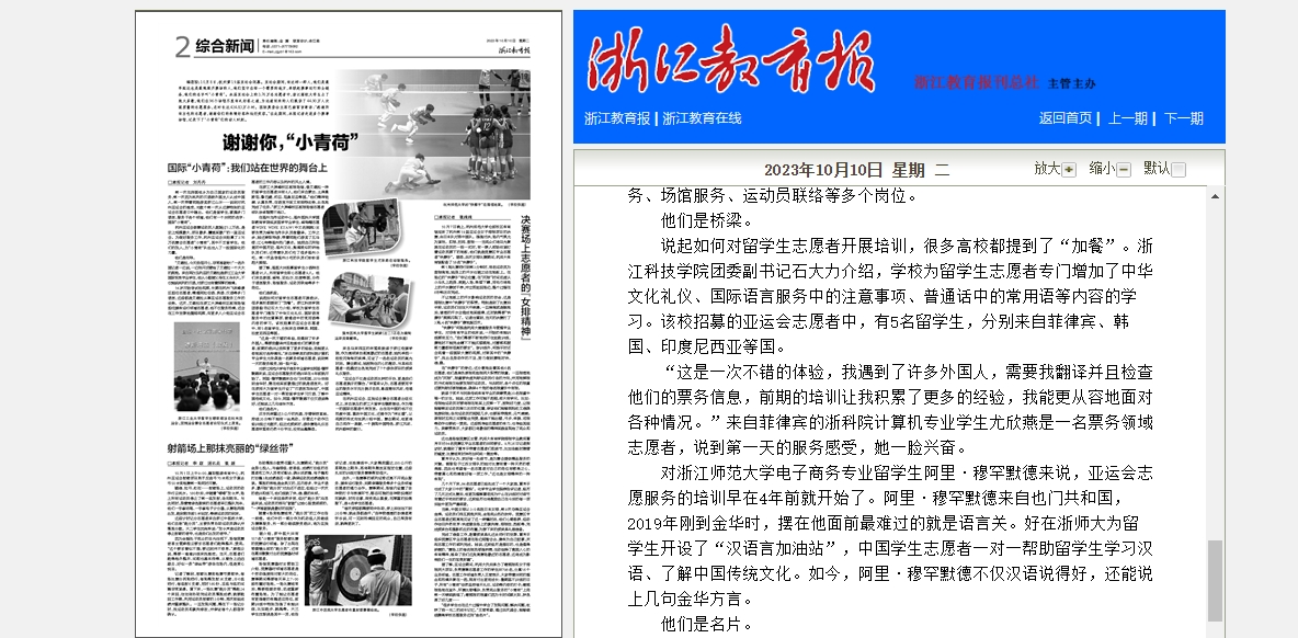 杭州亚运会参赛运动员人数超过1.2万名,是史上规模最大、项目最多、覆盖面最广的一届亚运会。为做好服务工作,杭州亚运会共招募了3.76万名赛会志愿者“小青荷”,其中不乏留学生。他们的加入,为“小青荷”队伍注入了一股国际化的力量。