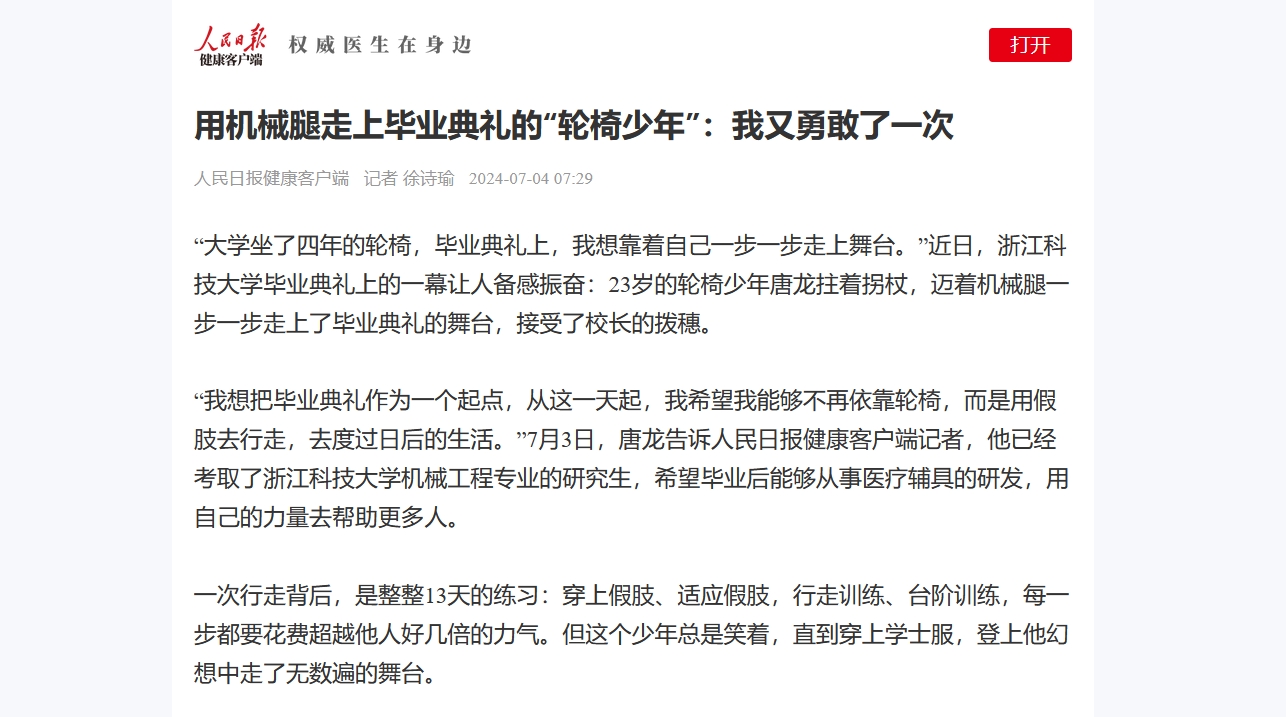 上台前,他跟妈妈说:“不许哭哦,还得读研究生呢,要笑着看我毕业。”唐龙告诉人民日报健康客户端记者:“我知道妈妈一直想看我像普通人一样,正常生活、正常行走。我做到了!我又勇敢了一次。”