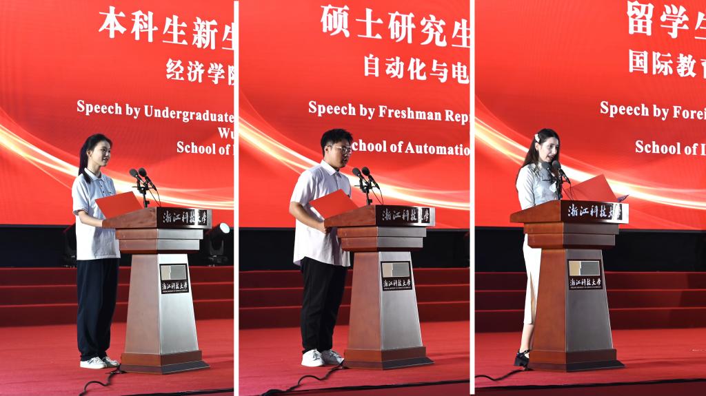罗马尼亚籍曲沛涵代表留学生新生发言。她曾以语言生身份在我校学习,现选择在汉语国际教育专业继续深造。她说,浙科大为我们提供了丰富的实践平台,沉浸式体验中国文化的博大与包容,让我不断地“读懂中国”。“我愿成为中罗文化交流的桥梁,为加深两国友谊贡献力量。”