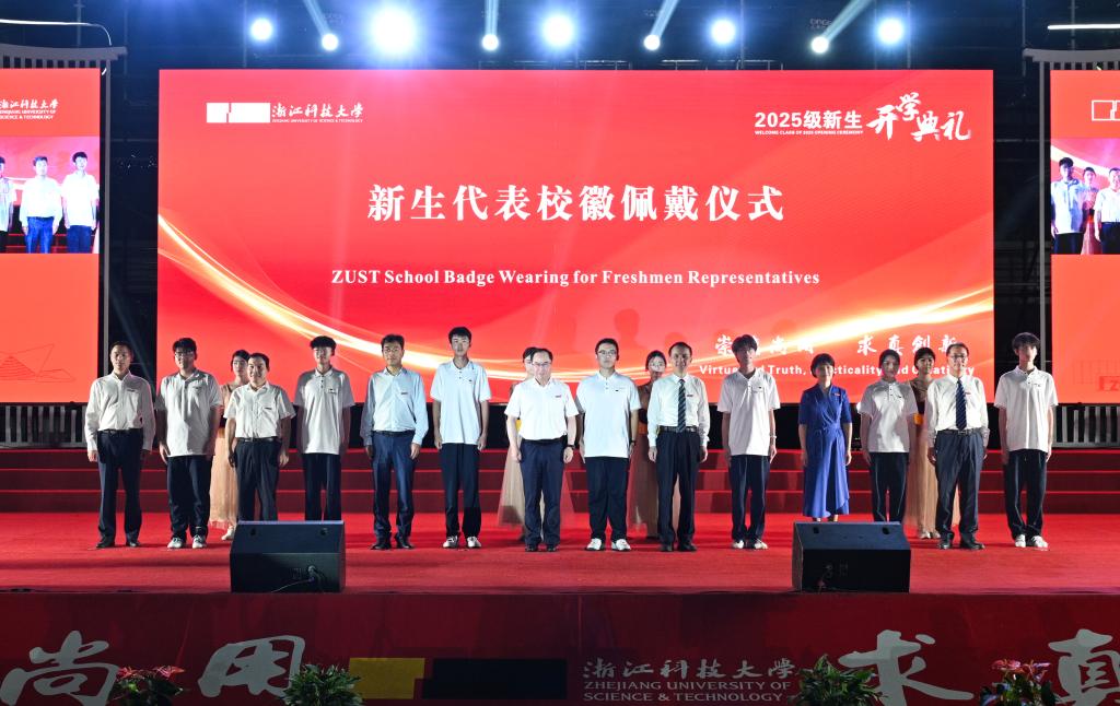 典礼上,赵东福、陈建孟等校党政领导班子成员为学生代表佩戴校徽。全体新生整装肃立,在师长的共同见证下,郑重地将校徽佩戴至左胸前,标志着他们正式成为浙科大的一员,他们将心怀梦想、砥砺奋进,在科大校园书写无愧于时代的青春答卷。