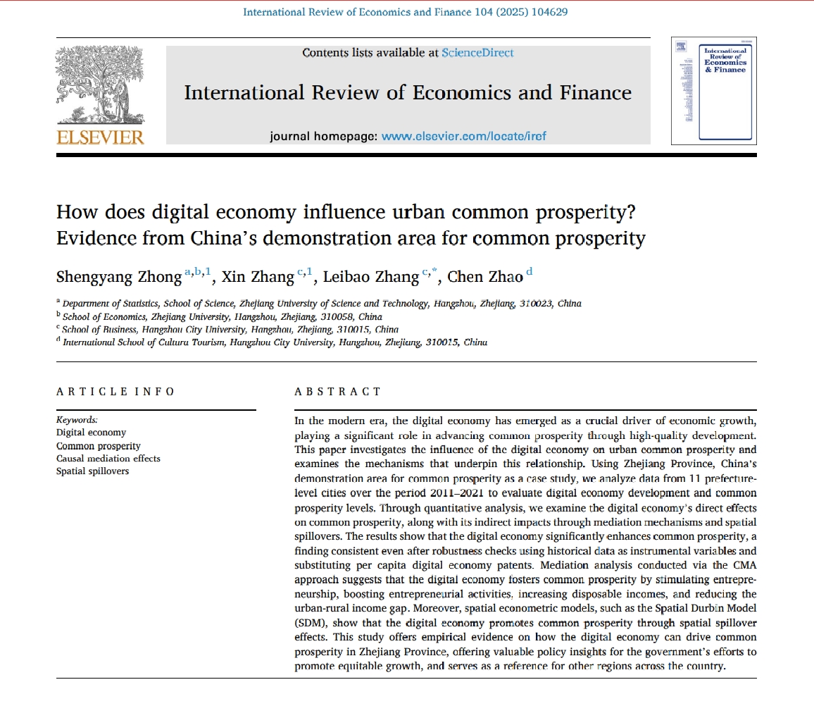 日前,应用统计与金融数学团队钟声扬博士与合作者在经济/金融领域权威期刊《International Review of Economics and Finance》上发表了题为“How does digital economy influence urban common prosperity? Evidence from China’s demonstration area for common prosperity”(阅读原文)的研究论文。此论文钟声扬博士为第一作者,久久精品一区二区|久久久一区二区三区|欧美日韩视频|欧美福利视频|高清欧美性猛交xxxx黑人猛交|久久久www成人免费精品|在线观看成人网站为第一完成单位,浙江大学为第二单位。