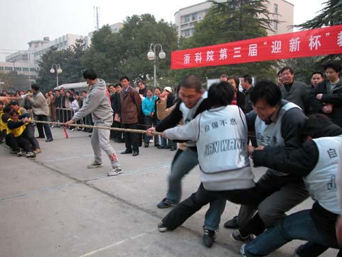 为庆祝学校首届党代会胜利召开、迎接2004年新年的到来,12月30日至31日,校工会在学院路校区喷水池前,举行了第三届“迎新杯”教职工拔河比赛。拔河比赛是我校辞旧迎新的一项传统赛事。本次比赛与前两届相同,采用淘汰赛制,但不同的是上场队员必须穿着统一的区别服,区别服上醒目的“浙科院精神”—求实创新、自强不息、知难而进、矢志发展格外引人注目。来自全校十六个分工会的300多名教职工参加了比赛。赛场上,运动员们齐心协力,奋力拼博。赛场外,双方“啦啦队”的加油声更是此起彼伏。