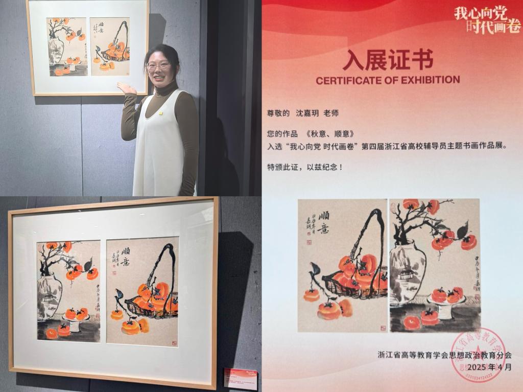 4月25日,“我心向党,时代画卷——第四届浙江省高校辅导员主题书画作品展暨公益拍卖活动”在中国美术学院南山校区拉开帷幕。我校辅导员沈嘉玥的作品《秋意、顺意》入选。